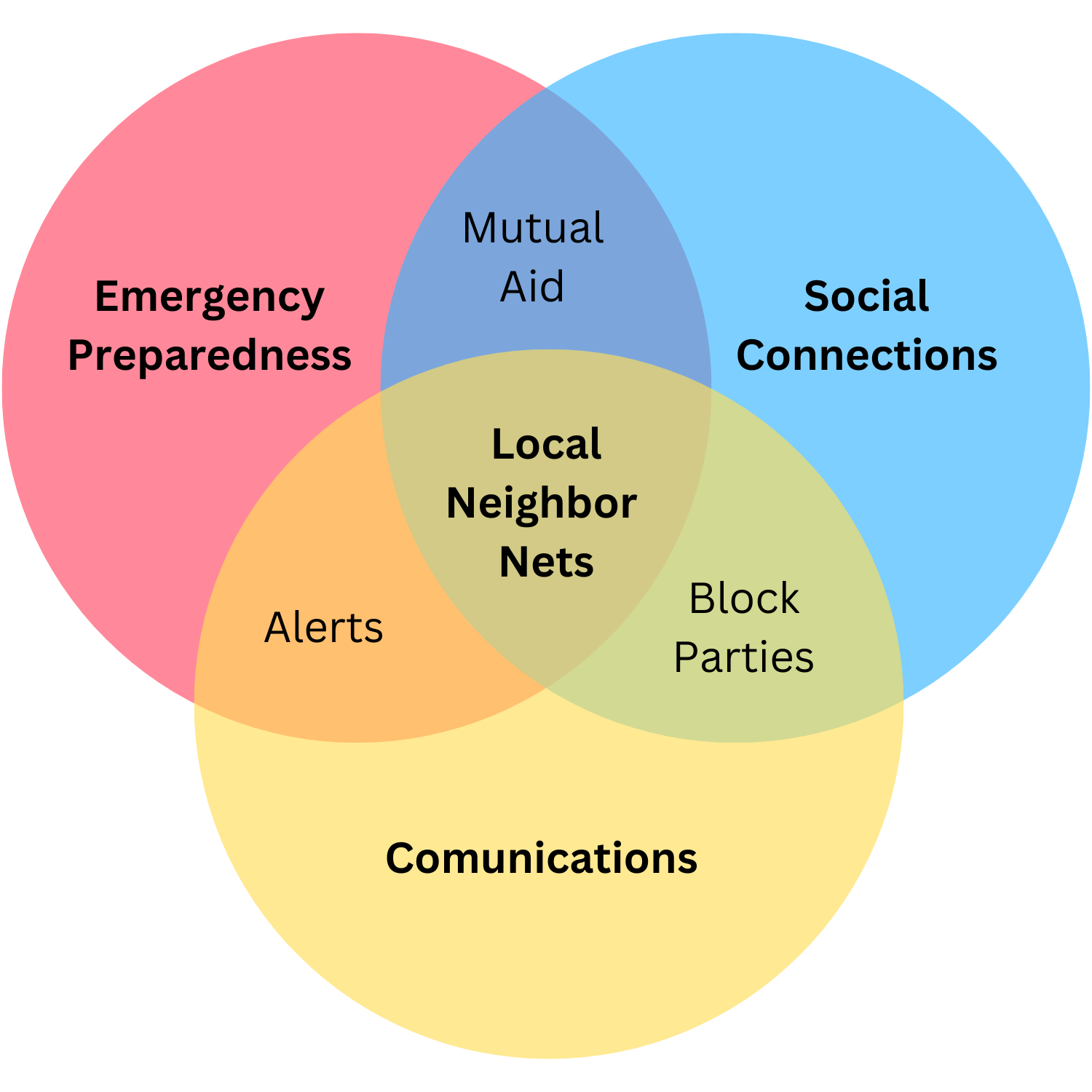 Defining the boundaries of each Local Neighbor Net happens “from the ground up” based on pre-existing connections and geography. Ideally each Local Neighbor Net has one or more volunteer Local Neighbor Net Coordinators who work to define their neighborhood, build a contact list of their neighbors, and serve as the messenger sharing news to and from the neighborhood.